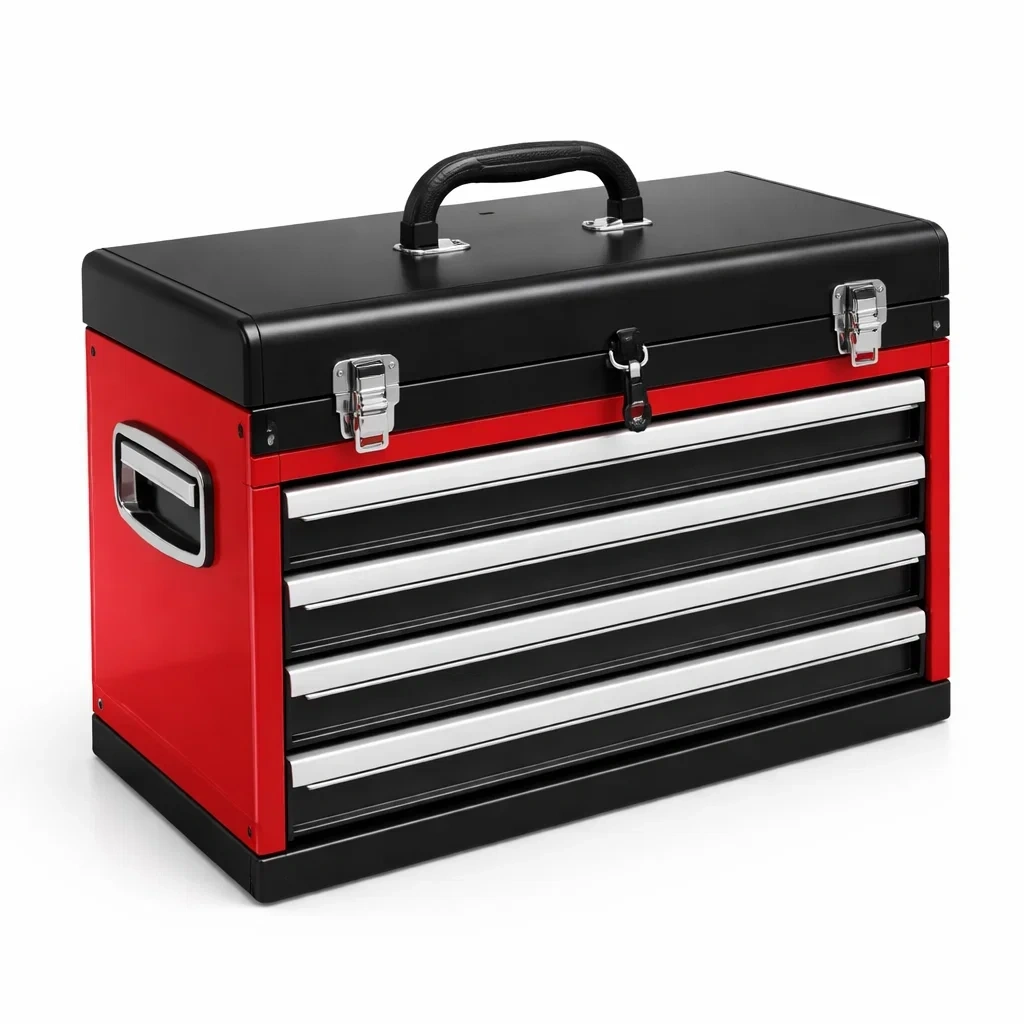 La cassetta degli attrezzi è realizzata in metallo, dotata di maniglie laterali in acciaio inox e una maniglia superiore rivestita in plastica dura. Dimensioni: 51 cm di lunghezza, 22 cm di larghezza e 30 cm di altezza. Include 4 cassetti con guide scorrevoli e chiusura a chiave. Colore rosso con dettagli neri.