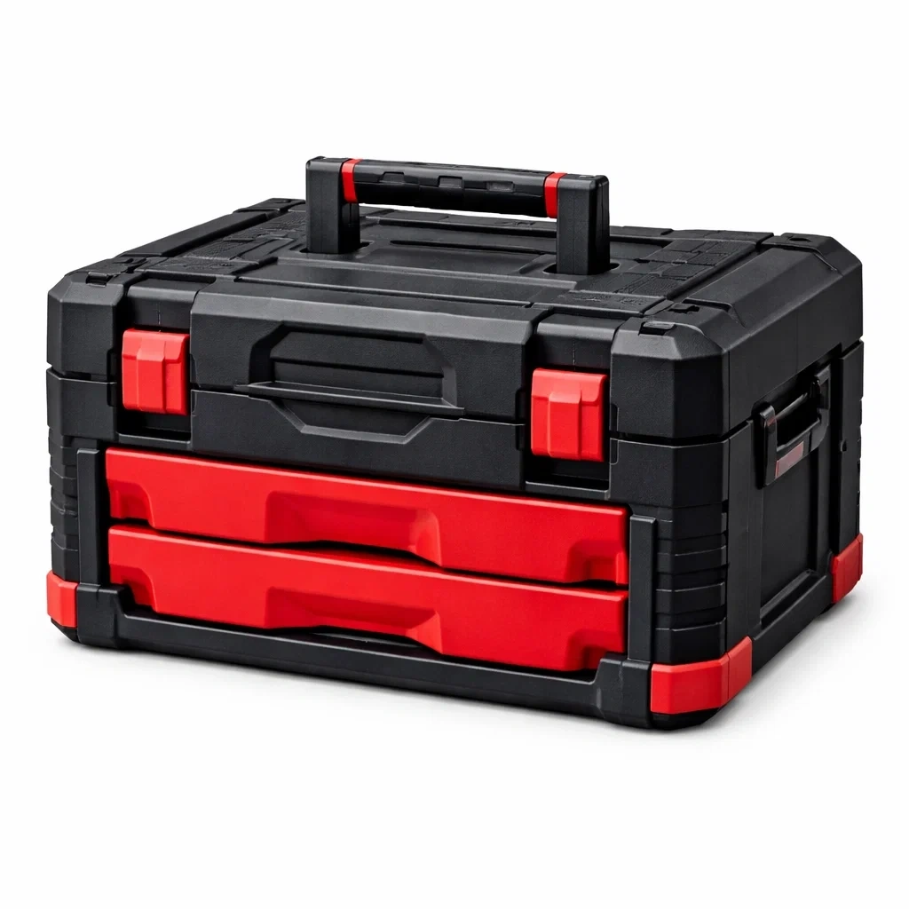 Cassetta degli attrezzi in plastica nera e rossa con cassetti multipli