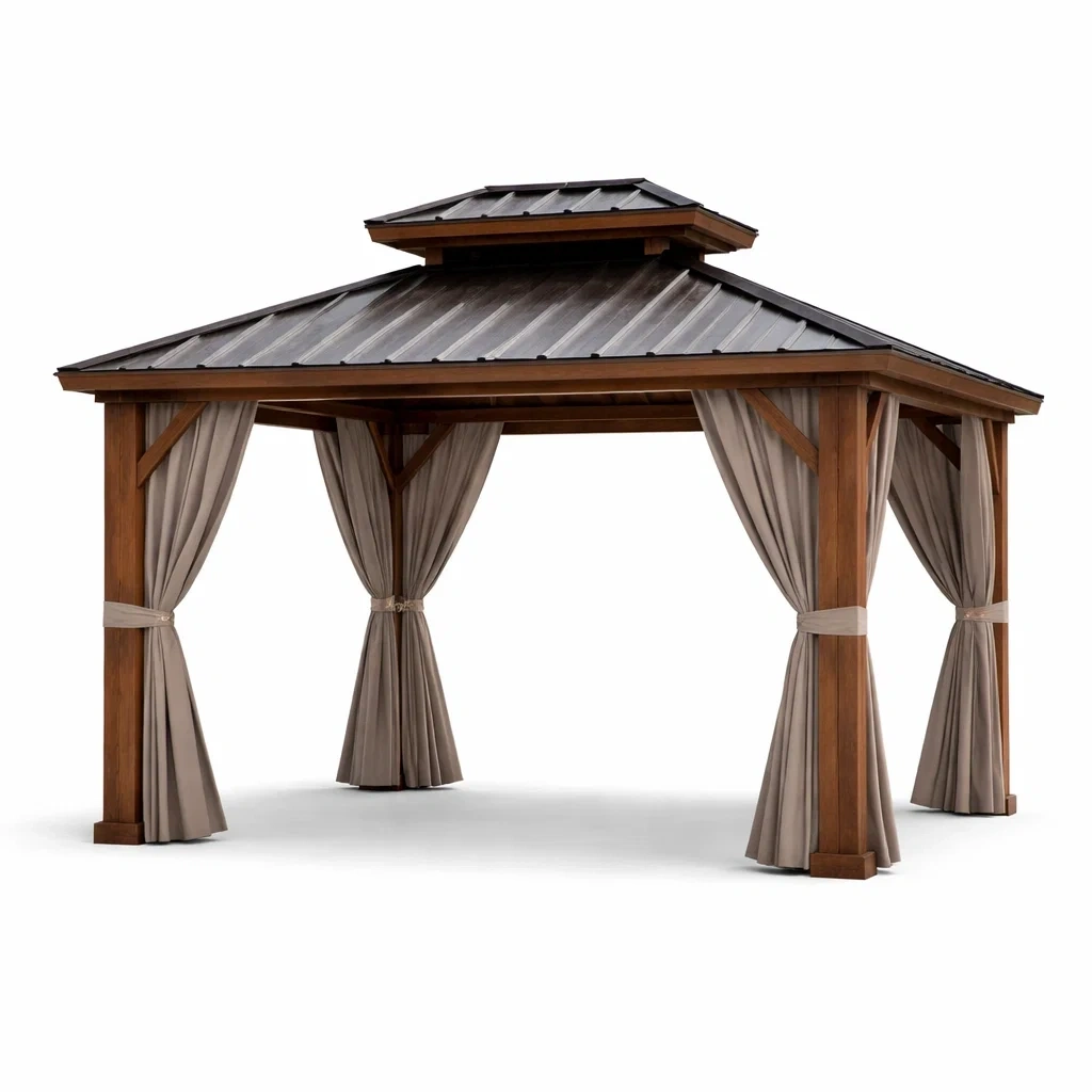 Dimensioni: 400 cm x 300 cm x 280 cm. Area: 12 m². Materiali: struttura in legno massello, tetto in acciaio zincato, tende in poliestere. Colori: struttura marrone, tende grigie. Peso netto: 100 kg. Funzioni: resistente all'acqua, protezione solare. Pulire con un panno umido e evitare esposizione a condizioni estreme.