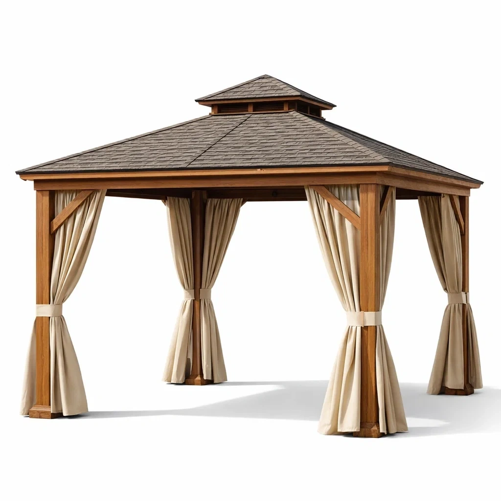 Gazebo in legno con tetto in tegole bituminose e tende beige