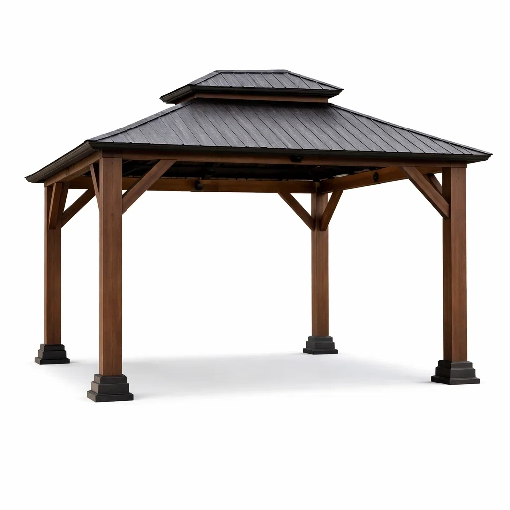 Struttura realizzata in legno massello con tetto in metallo rivestito. Le dimensioni del gazebo sono 400 cm di lunghezza, 300 cm di larghezza e 270 cm di altezza. Il colore principale è marrone/nero. Peso totale del prodotto: 250 kg. È resistente all'acqua e alle prestazioni antivento. Prodotto fisso non mobile.