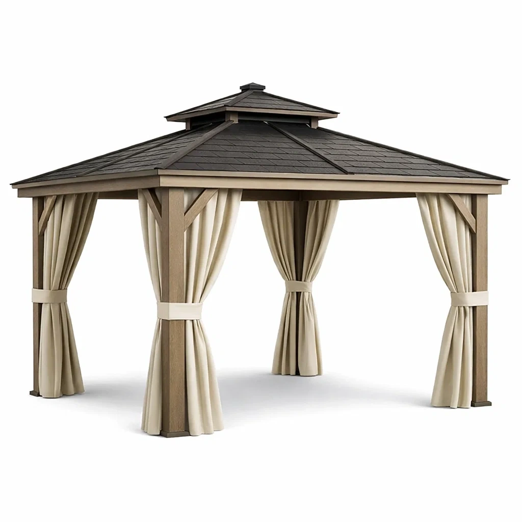Struttura in legno con tettuccio in policarbonato resistente alle intemperie e tende in poliestere. Dimensioni: 360 cm lunghezza, 300 cm larghezza, 270 cm altezza. Colori: Beige e Nero. Peso totale: 98 kg.